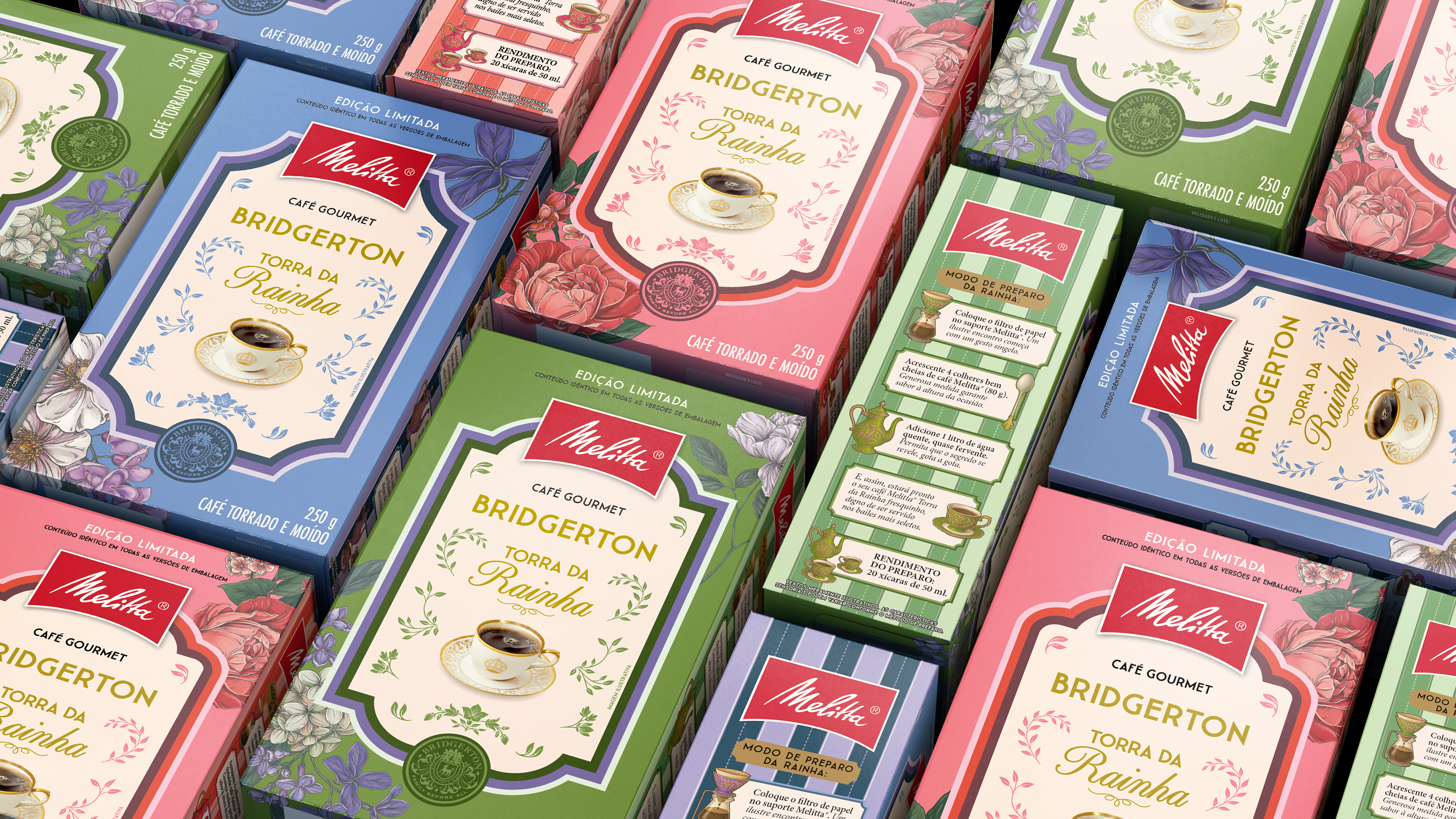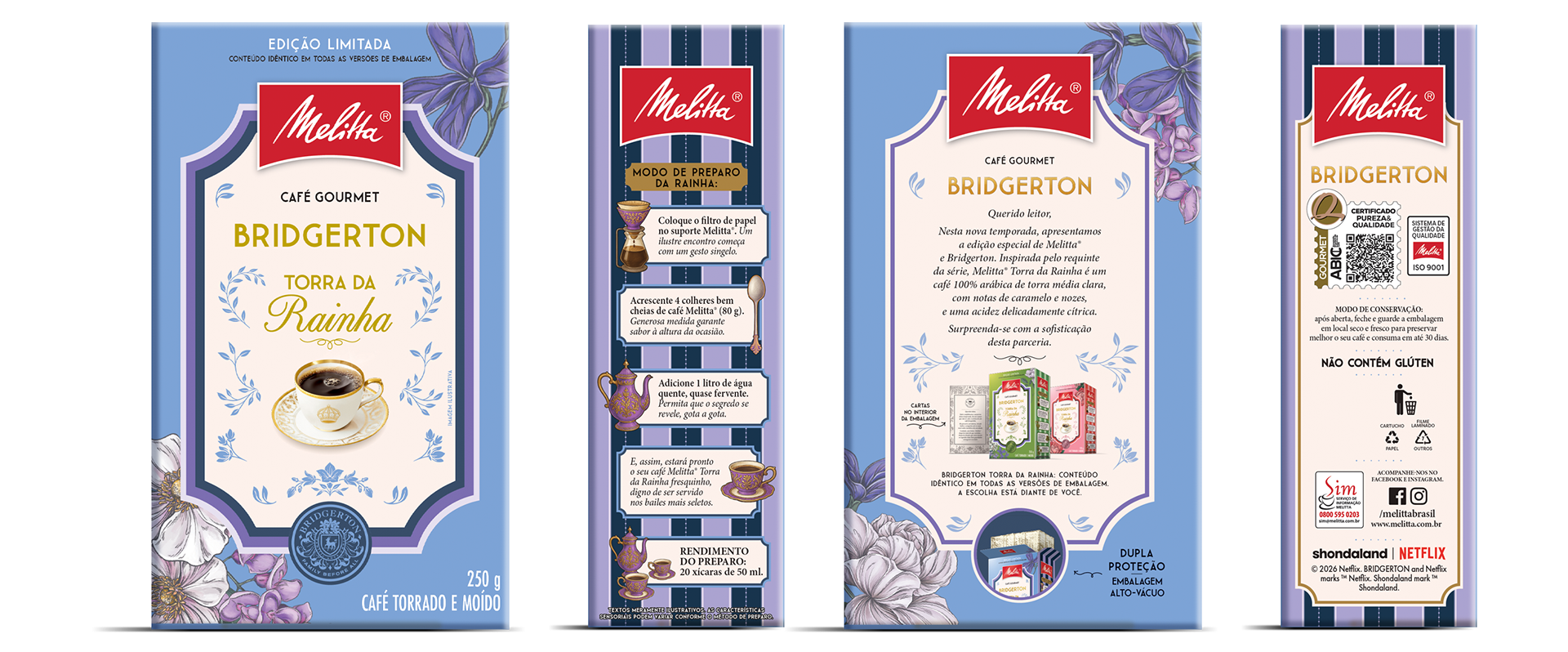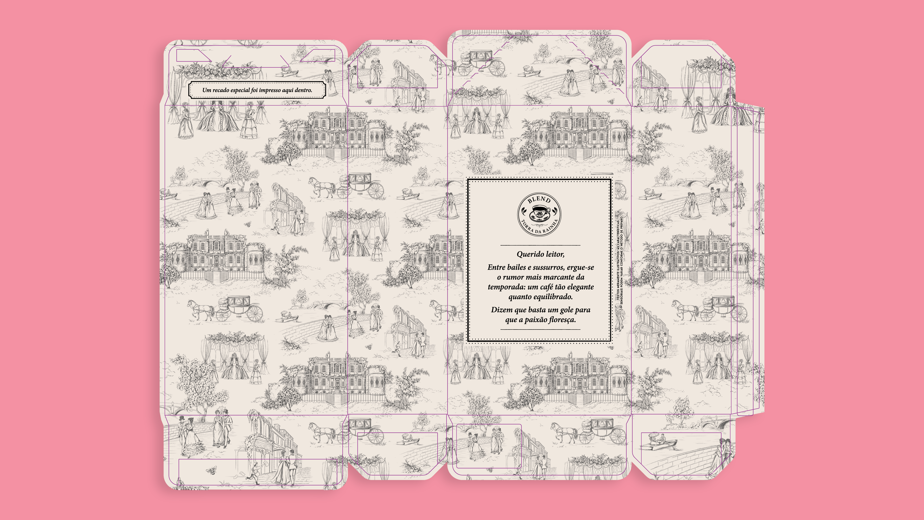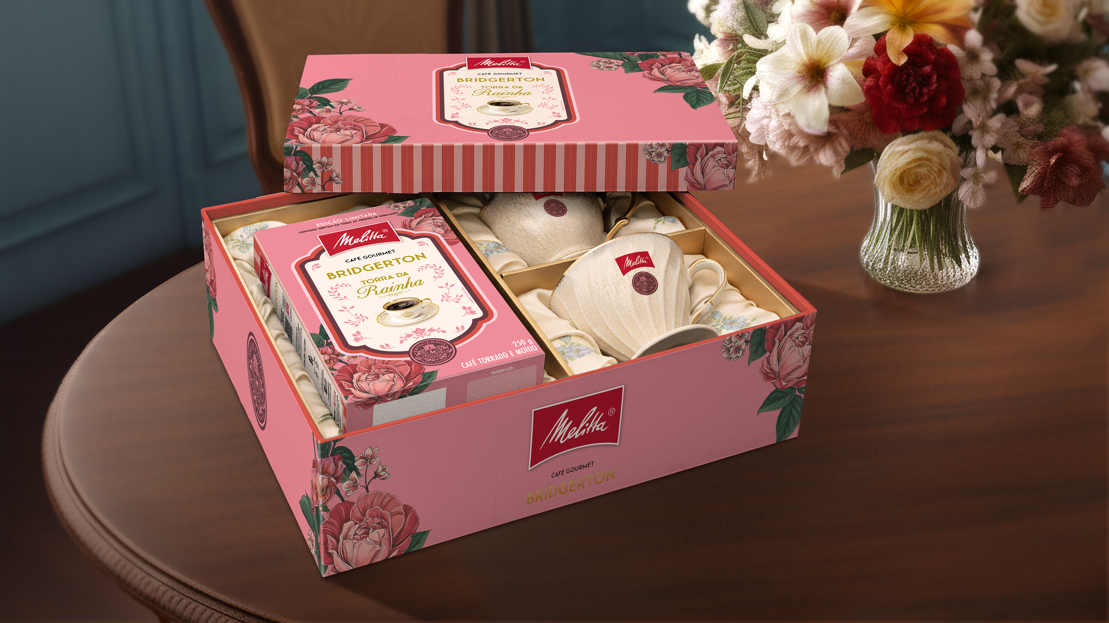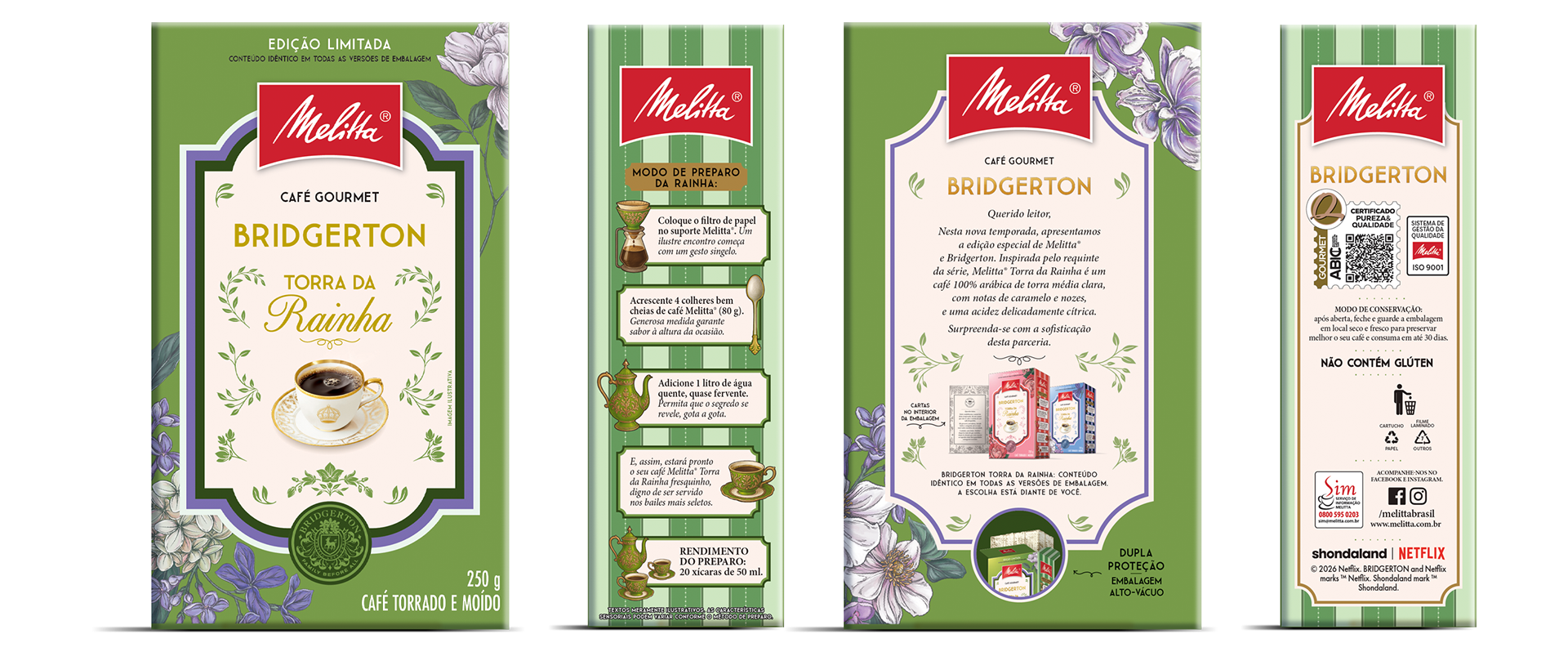 Cada uma das três embalagens foi pensada como um objeto de desejo: jardins secretos, ornamentos clássicos e uma estética que traduz o luxo da série. Os acabamentos gráficos elevam a experiência: relevo, verniz brilhante e hot stamping dourado no logo criam textura, brilho e profundidade, convidando ao toque.