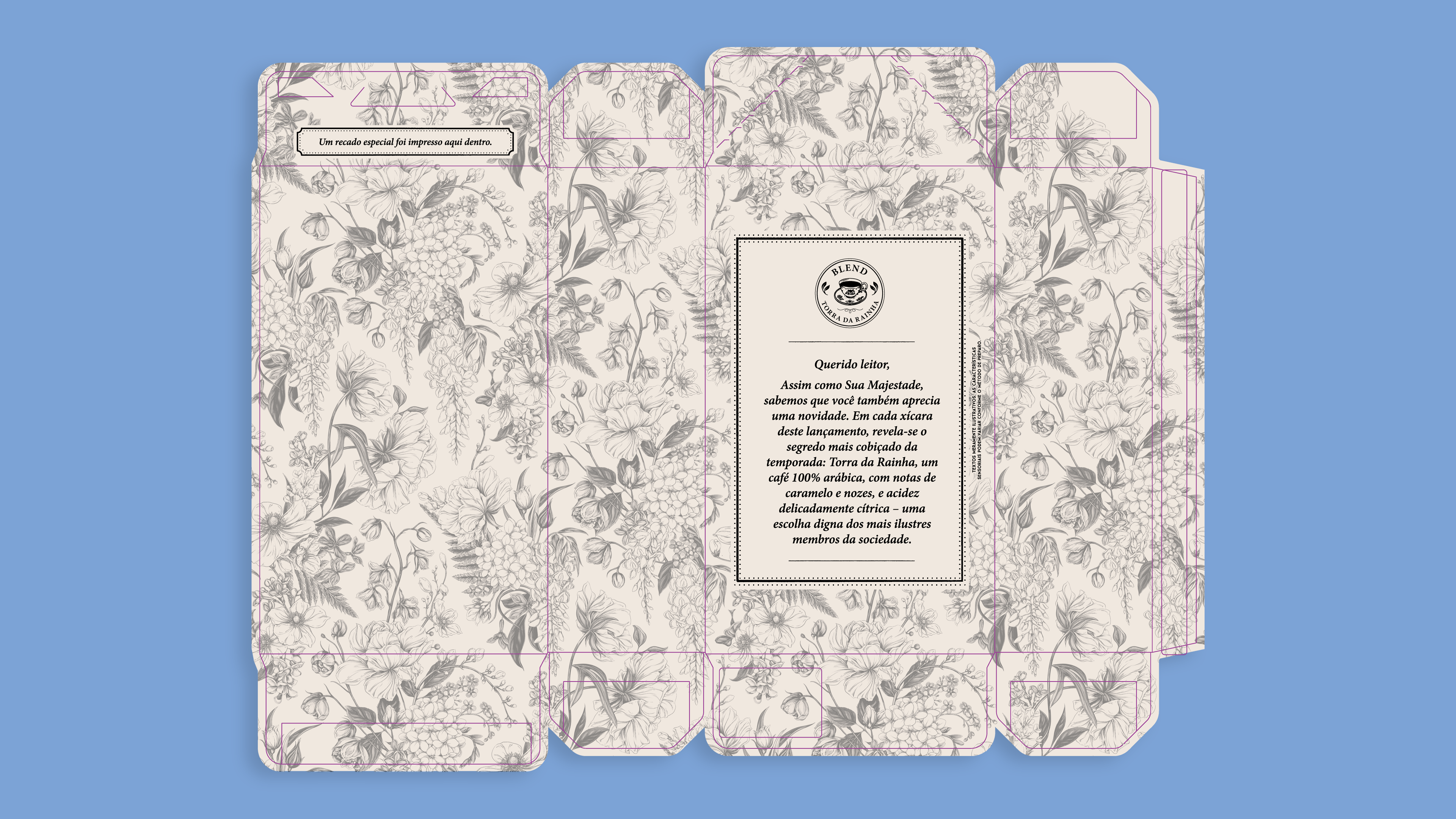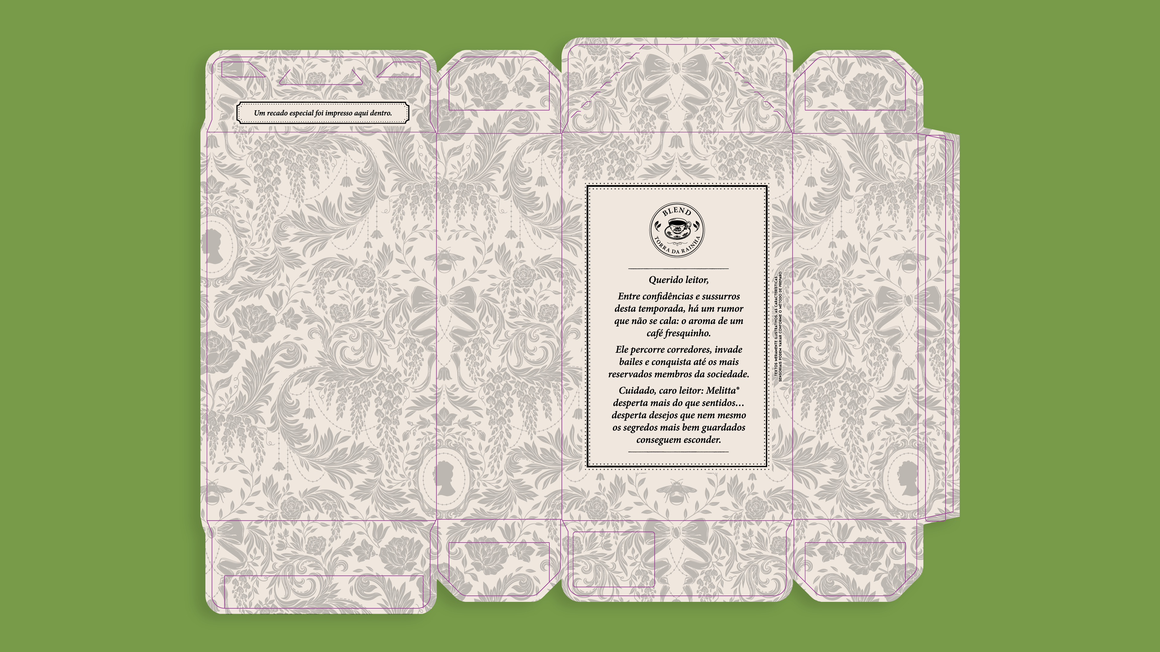 Mas o verdadeiro segredo se revela depois da abertura. No verso interno, cada embalagem traz um texto secreto, no tom verbal das cartas da série, impresso para ser descoberto ao abrir, uma leitura reservada a quem atravessa o ritual até o fim.